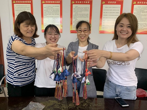 在傳統(tǒng)習俗中,玲瓏可愛的各色香包也是端午節(jié)必不可少的元素。包完粽子后大家轉移陣地到了活動室,大家圍坐桌邊,面前堆放著一份份材料包,有棉布、艾草、針線、中國結流蘇。面對這個從來沒有做過的DIY,大家開始研究起來,有的用手機搜索縫制方法流程,有的直接比來比去親自摸索著縫起來。有職工說:“這有點像咱們小時候老人們縫的毽子,那個里面裝的是五谷雜糧,咱們現(xiàn)在裝的是艾草?!薄斑@香囊可以掛在辦公室或者車上,有清香、驅蚊的功效?!薄拔宜闶侵懒?,這個流蘇應該縫在這個邊的中間,而不是角上……”大家你一句我一句,手中的針線穿梭在棉布間,用密密的針腳縫制出傳統(tǒng)佳節(jié)最好的注解,用絲絲線線纏繞出端午安康的美滿寓意,一個個精巧可愛的三角香囊在大家的努力下完美呈現(xiàn)。