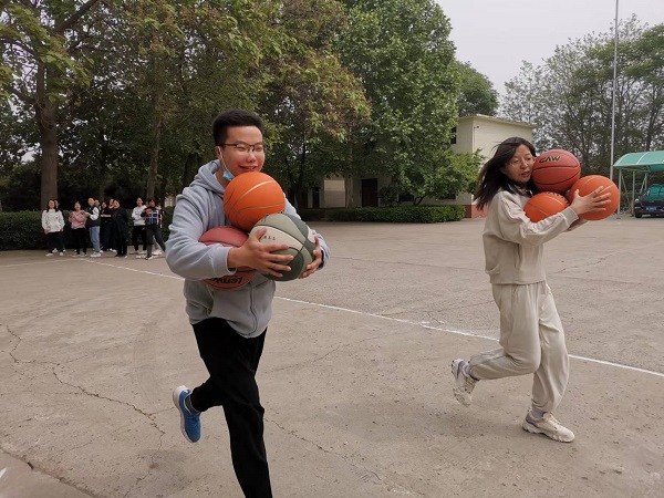“誰先來?抱球游戲升級(jí)——1人抱4個(gè)籃球向前奔跑,過程中一個(gè)球也不得落地,否則成績(jī)無效?!辈门兄坏膶徲?jì)科長(zhǎng)談增迫不及待地宣布?!皞€(gè)子高的胳膊、腿長(zhǎng),有優(yōu)勢(shì),先上?!比巳豪镉腥颂嶙h,工程科身高一米八的帥小伙劉文浩和綜合辦高個(gè)子王春影舉手示意,跑道上呈現(xiàn)二人灑脫、漂亮的抱球姿勢(shì)。