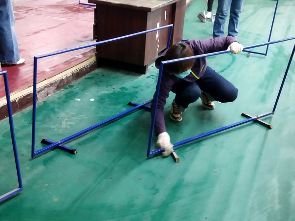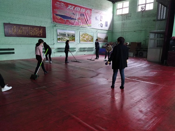 參與活動的20余名同志,分工合作,雖然大家來自不同部門、不同崗位,但爭先恐后、合作默契,清理地面、擦拭健身器材、清潔桌凳?!扒懊娴哪型緜兗佑土耍覀兛熠s上你們了!”負責拖地的九分公司主任經(jīng)濟師劉彩在后面說道。“這個乒乓球擋布拿抹布擦拭的效果不太好,用外面的高壓水槍沖洗試試吧!”九分公司主任會計師付世芳一邊用抹布擦拭擋布一邊提出自己的合理化建議,“這個辦法好!”九分公司綜合辦公室主任張路平同意道。