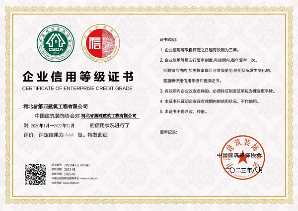 此次獲得中裝協(xié)AAA級(jí)企業(yè)信用等級(jí)證書,是中裝協(xié)對(duì)公司堅(jiān)持守法經(jīng)營(yíng)、誠(chéng)信經(jīng)營(yíng)的充分肯定和高度認(rèn)可,是對(duì)河北四建實(shí)力和品牌形象的最好詮釋。(質(zhì)量技術(shù)部)