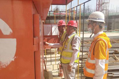 目前現(xiàn)場(chǎng)水泥粉磨車間、水泥配料站、水泥及礦粉儲(chǔ)存、電力室及空壓機(jī)站等房號(hào)處在主體施工和筒倉(cāng)滑模階段,施工緊張。水泥及礦粉儲(chǔ)存5個(gè)筒倉(cāng)從6月下旬開始滑模,施工期間需要24小時(shí)不停作業(yè),為保障雨天滑模順利,項(xiàng)目部采用了上人梯踏步安裝防滑條、操作平臺(tái)搭設(shè)防雨棚、各班組穿插作業(yè)等有效舉措。目前筒倉(cāng)已滑過庫(kù)底板至14.4米,進(jìn)度和質(zhì)量均得到甲方好評(píng)。水泥磨車間架體、水泥磨基坑等均屬于“危大工程”,項(xiàng)目部特別加強(qiáng)過程管控和雨后巡檢,經(jīng)常組織相關(guān)人員對(duì)架體整體是否有沉降、垂直度偏差、管件緊固程度等進(jìn)行仔細(xì)檢查,確保架體穩(wěn)固。深基坑周邊設(shè)擋水墻和排水溝,護(hù)坡采用噴射混凝土以及彩條布覆蓋等措施進(jìn)行加固,防止基坑護(hù)坡坍塌。
