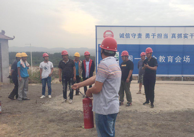 項目部即將進行墊層混凝土澆筑施工,現(xiàn)場有大量的木模板、油漆等易燃品,正值高溫季節(jié),火災(zāi)隱患較大。項目部結(jié)合現(xiàn)場實際組織了本次消防演練,演練分為消防知識培訓(xùn)和火災(zāi)事故演練兩部分。演練前項目經(jīng)理李宏偉通報了溫嶺槽罐車爆炸事故造成的嚴(yán)重后果,闡明本次演練的目的和意義。隨后項目部安全員王東春對滅火常識、火災(zāi)逃生方法、滅火器如何使用等進行了講解,并演示了手提式干粉滅火器的具體使用方法,參與演練的人員親自體驗了滅火器的使用。