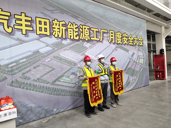 會(huì)上,業(yè)主對(duì)所有參建單位自開工以來(lái)的安全管理情況進(jìn)行了總結(jié),對(duì)兩家先進(jìn)集體和兩名先進(jìn)個(gè)人進(jìn)行了表彰。天津一汽樹脂車間項(xiàng)目部由于規(guī)范嚴(yán)謹(jǐn)?shù)墓芾?,在眾多施工單位中脫穎而出,榮獲“五月份安全施工模范單位”錦旗;項(xiàng)目安全員王喜峰榮獲“優(yōu)秀安全員”榮譽(yù)稱號(hào)。日方課長(zhǎng)督查佐藤和一汽豐田汽車總部副總經(jīng)理相馬清親對(duì)天津一汽新能源工廠項(xiàng)目部安全工作給予了表彰,項(xiàng)目經(jīng)理苗建偉在會(huì)上做交流發(fā)言,介紹了項(xiàng)目施工安全管理經(jīng)驗(yàn)。
