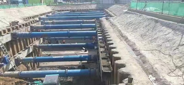 該工程于今年5月中旬開始施工,項目部提前編制了專項施工方案,并經(jīng)過專家論證。5月25日基坑開挖,項目部弘揚工匠精神,基坑圍護根據(jù)方案及現(xiàn)場環(huán)境采用拉森鋼板樁支護,轉(zhuǎn)角部位水泥樁加固支護。開挖土方至1.5米,設(shè)置第一道支撐,采用直徑609毫米×14毫米鋼管作為對撐或斜撐。開挖至坑底,墊層施工、支護樁之間設(shè)置第二道支撐,坡頂采用鋼筋網(wǎng)固定,噴射細石混凝土?;舆吰鲋跛畨?,設(shè)置排水溝。指定第三方檢測單位進行每日變形監(jiān)測。