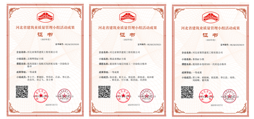 5月15日,七分公司申報(bào)的“提高防水卷材SBS一次封邊合格率”“提高剪力墻層間施工一次驗(yàn)收合格率”“提高混凝土裝配式免拆板安裝一次驗(yàn)收合格率”三項(xiàng)QC成果,被河北省建筑業(yè)協(xié)會(huì)評(píng)為“一等成果”。這不僅是河北省建筑業(yè)協(xié)會(huì)對(duì)分公司技術(shù)創(chuàng)新能力的高度認(rèn)可,更是分公司扎實(shí)開(kāi)展QC小組活動(dòng)、有效攻克施工難題、提升項(xiàng)目施工質(zhì)量的生動(dòng)寫(xiě)照。